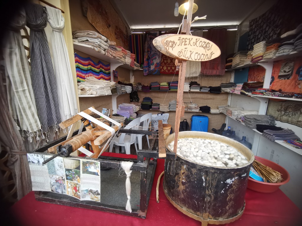 Les cocons sont plongés dans de l’eau très chaude, qui permet de séparer les fils. Une machine tisse les fils. Ils sont ensuite colorés avec des composants naturels : curcuma, safran, indigo, etc.