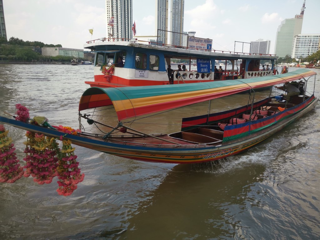 Petite balade sur la Chao Phraya River en bateau pour se mettre dans l’ambiance, avec un peu de vitesse par moments, le chauffeur s’amuse ! Mais ça pollue énormément à y regarder de plus près…