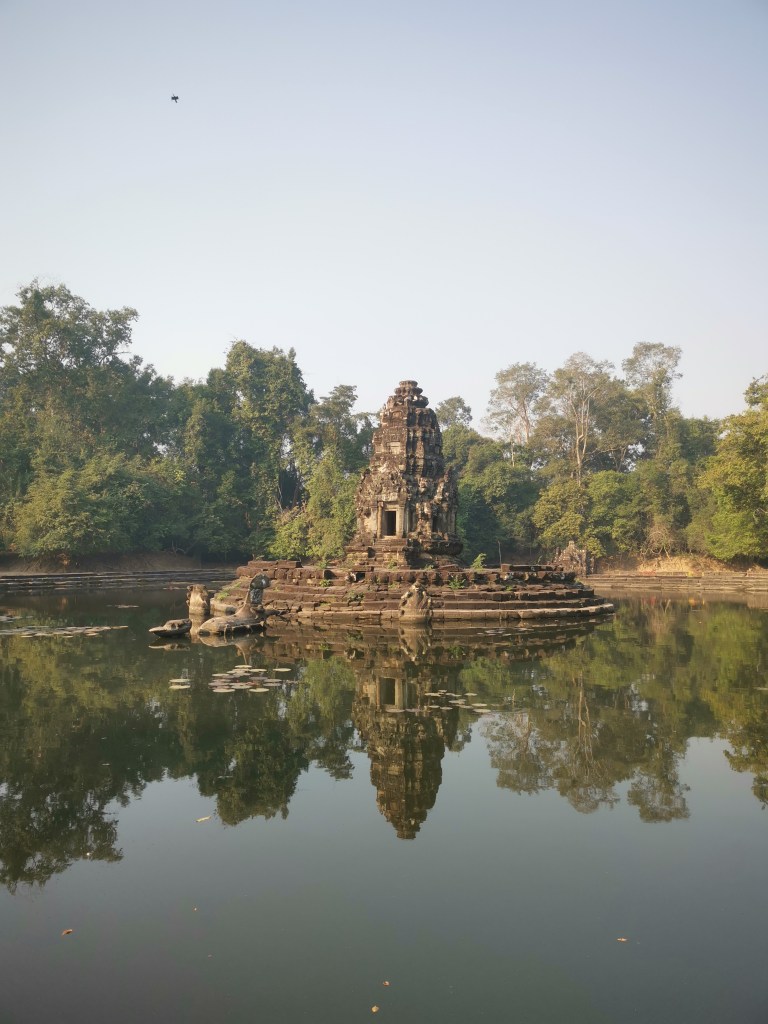 Preah Neak Pean se laisse désirer. Cette île artificielle boisée cache, en son centre, ses « serpents entrelacés ». C’est un ancien lieu sacrificiel pour les rites de purification. L’eau domine ici, et pour cause, les quatre bassins ont une signification. L’un, présidé par une tête d’éléphant, représente l’eau. Un autre porte une tête de lion pour le feu. Le suivant présente une tête de cheval pour le vent. Et le dernier propose une tête d’humain pour la terre.
