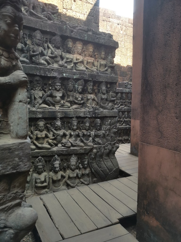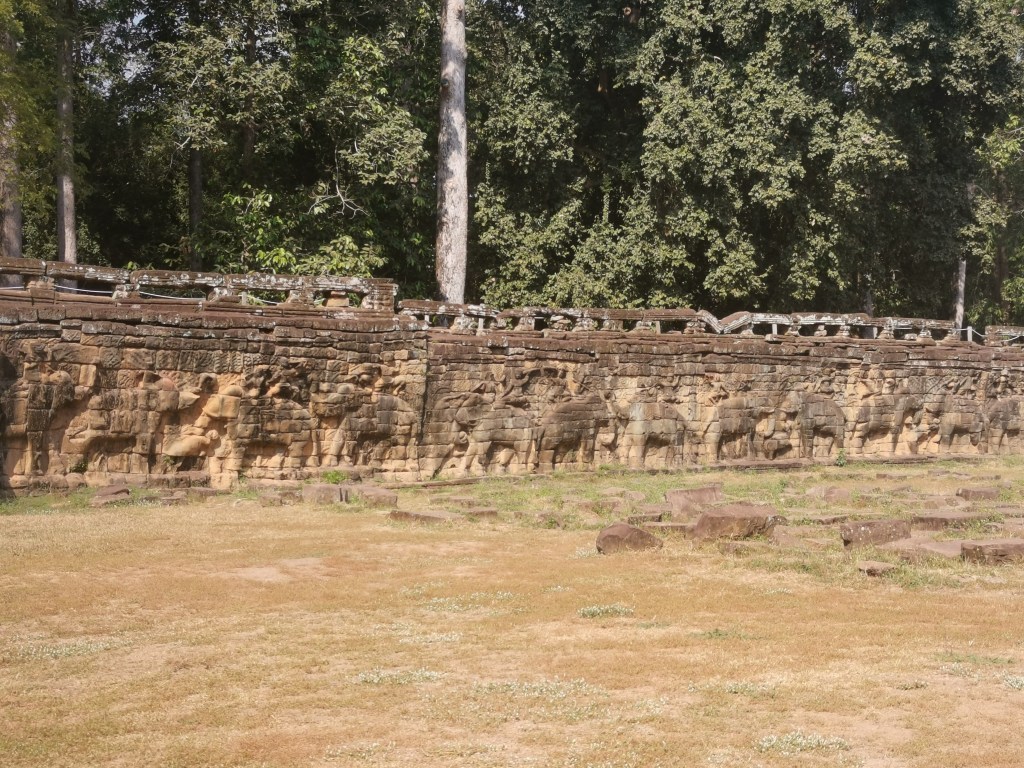 La terasse des éléphants ❤️ ce livre ouvert, cette fresque, cette magnificience artistique, qui renferme l’histoire des événements célèbres de la cité d’Angkor. Cette terrasse d’apparat royal livre une grande variété de sculptures et de bas-reliefs, images mystiques des éléphants, des lions et des Garudas – oiseau mythique. Érigée de façon à ce que le roi puisse assister tranquillement aux spectacles et parades des soldats et éléphants.