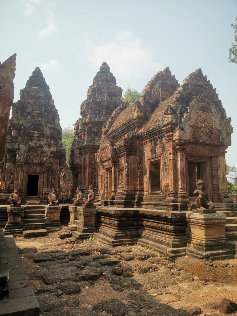 La poursuite de l’épopée oblige à changer de monture. Située à plus de vingt kilomètres au nord-est du site, la citadelle des femmes, ou de la fortune, est ravissante. Banteay Srey ❤️ temple plat aux pierres roses, est un carnet de dessins. Les détails y sont tous soignés et il peut même être qualifié de joyau de la couronne de la culture khmère. La mythologie brahmanique, entre autres, y est représentée en de très belles gravures, sculptures et bas-reliefs.