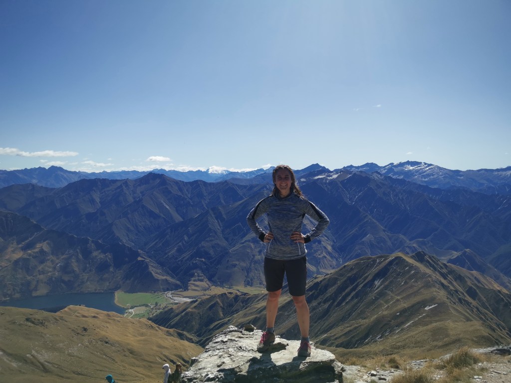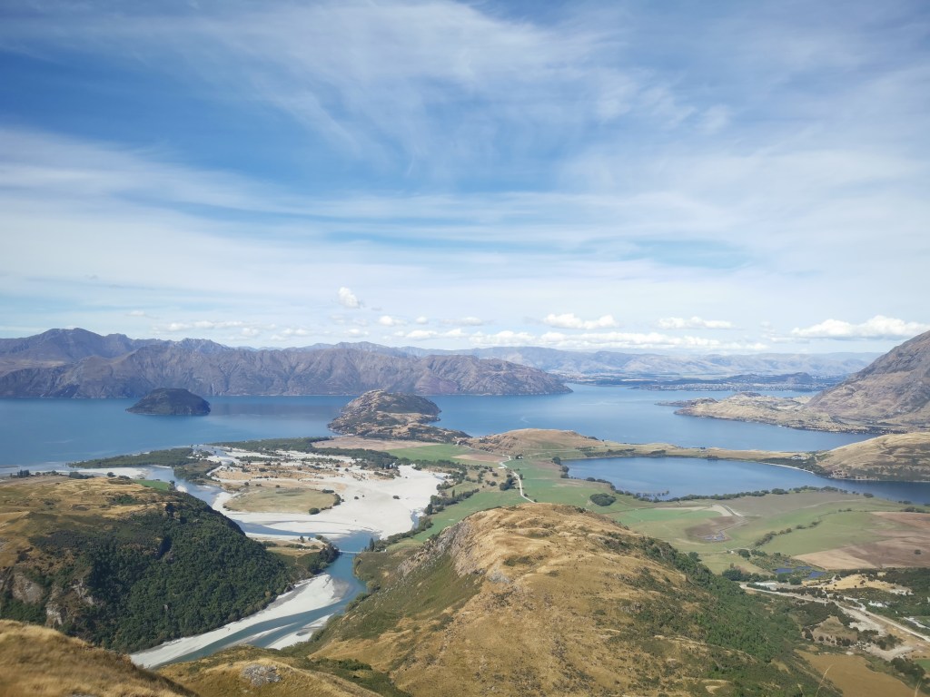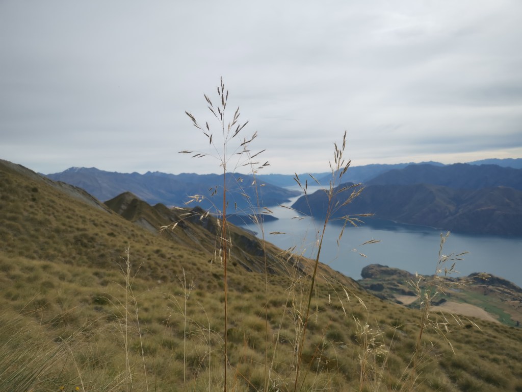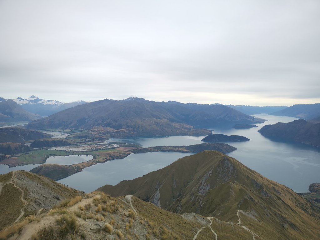 Le soleil était tout juste apparu que les nuages le cachait déjà. Il était temps de repartir. Quel bonheur de gravir ces mille soixante dix-huit autres mètres de dénivelés. Et quel spectacle ici-haut !! Des monts de partout. Tantôt au marron de la lande, tantôt recouvert d’arbres épineux, ou encore prêtant leurs cimes à des glaciers. Et le lac Wanaka, sublime et envoûtant…