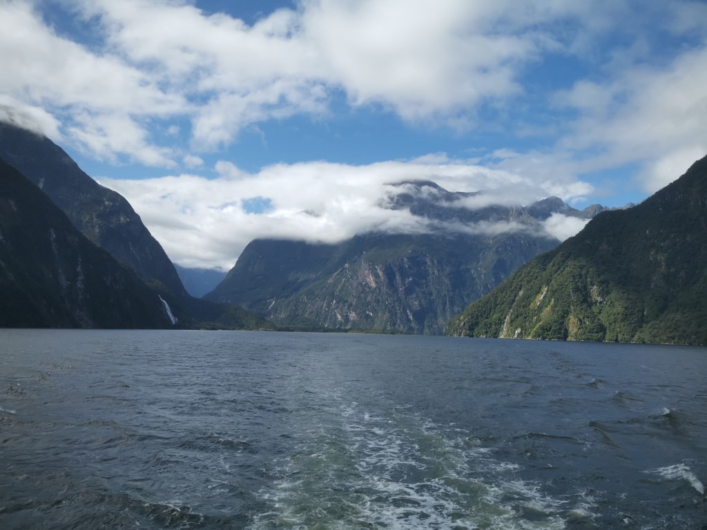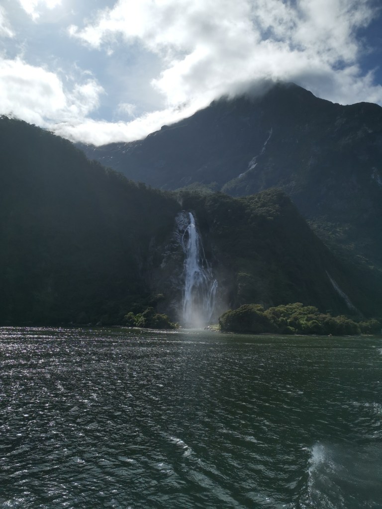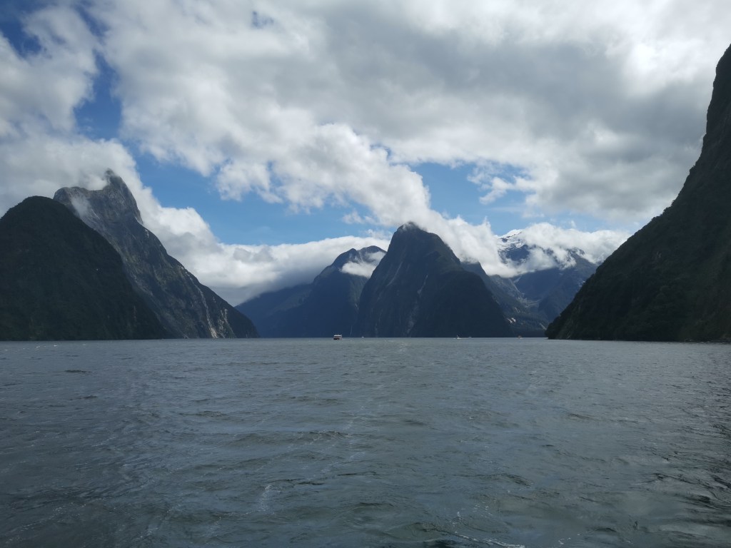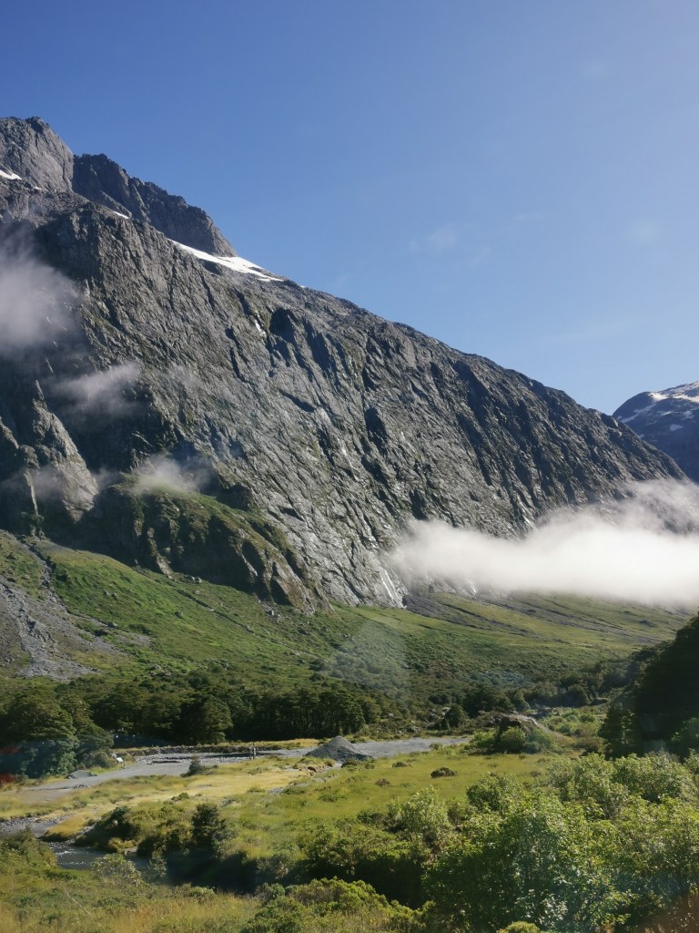 Réveil avant les aurores. La nuit avait été courte. Mais ce jour était un jour spécial pour la voyageuse. Elle allait réaliser un autre de ses rêves. C’était tout juste un an après avoir découvert la magie des fjords en Norvège. Ce calme, cette grandeur, cet apaisement qui prend tout l’être. L’hiver norvégien avait stoppé la circulation fluviale sur ces eaux de mer glaciales. Intrigant cette héroïne. Ici, c’était l’été. Et cette fois, c’étaient les inondations qui avaient détérioré la route d’accès à Milford Sounds, empêchant les véhicules des touristes de s’approcher de ce Fjordland. Hormis par le biais d’une croisière via un bus touristique. La chance était de son côté ! Le jour se levait sur ce car de touristes endormis. Et la magie commençait à s’opérer. L’on rentrait dans la vallée. Les montagnes les entouraient de toute part. D’abord lointaines, puis très proches. Les ruisseaux aux eaux claires et pures serpentaient, insouciants de ce qui se passait alentours. Les nuages jouaient avec les montagnes. Les glaciers bleus surveillaient, perchés hauts, sur les sommets dominants, enneigés.