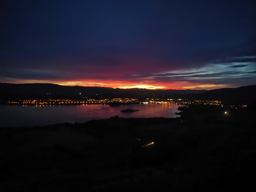 Qui le fût encore plus lorsque le soleil, qui s’était à nouveau dissimulé derrière les nuages après un bel après-midi, réémergea pour se coucher ici, et éclairer l’opposer de la planète, laissant une trame rosée au sommet des montagnes.