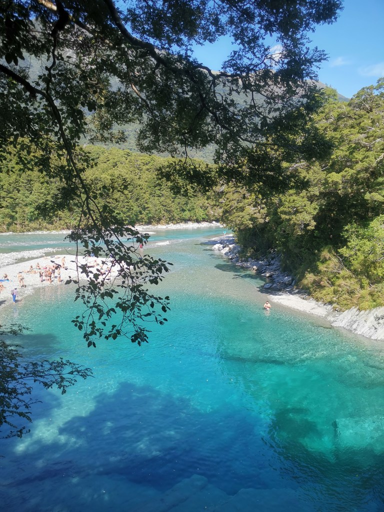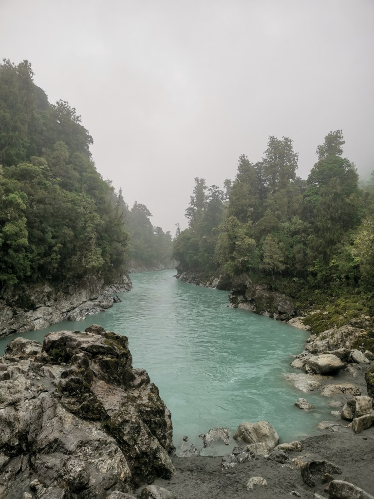 La globe-trotteuse repris donc sa voiture, un peu déçue, en direction de Hokitika Gorge. En additionnant des dépôts de roches, de la glace de glacier fondu et l’eau d’une rivière, l’on obtient ce merveilleux mélange et cette belle rivière turquoise. Magnifique !