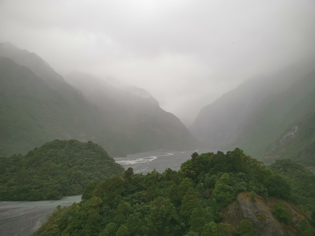Franz Joseph Glacier s’appelait à l’origine Ka Roimata o Hine Hukatere. C’est un très vieux glacier qui, il y a dix-huit mille ans s’étendait jusqu’à la mer. Actuellement, il n’est presque plus visible. Voir inatteignable, comme aujourd’hui, à cause de l’instabilité du sol qui est fragilisé par la quantité de pluie qui tombe ici chaque année – il pleut près d’un jour sur deux. Et la vitesse de sa fonte est phénoménale… Et triste.