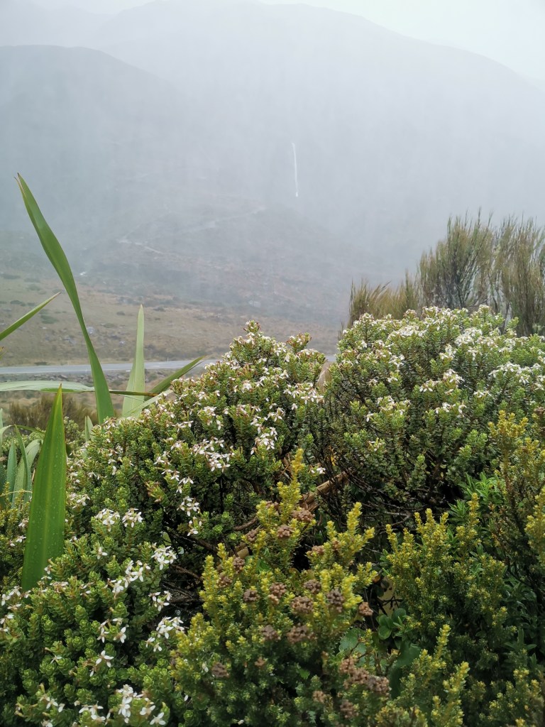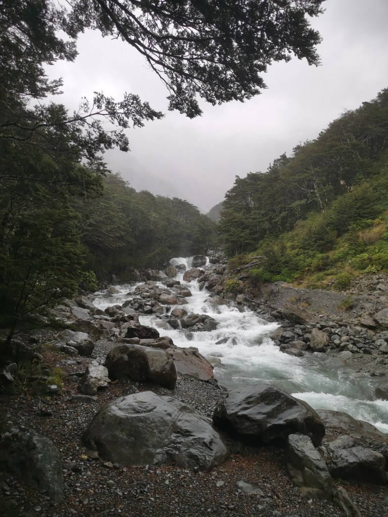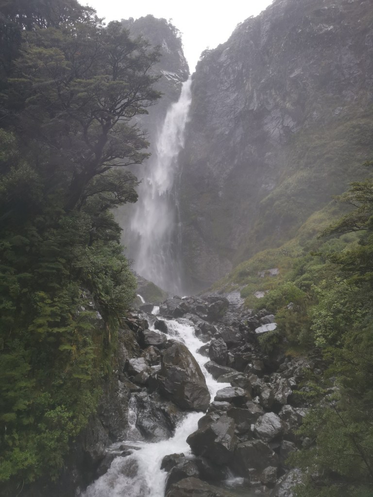 Journée pluvieuse et venteuse à l’horizon… Direction Arthur’s Pass en espérant une accalmie. Ce qui a finalement été le contraire, avec des vents très forts et une pluie qui est tombée sans discontinuer. L’aventurière ne pouvait cependant pas rester enfermée toute la journée. Alors, en short et tee-shirt sous sa cape de pluie – il fallait mouiller le moins d’affaires possible ! – elle a été à la découverte de ce beau parc national, bien connu pour son fort taux de précipitations.