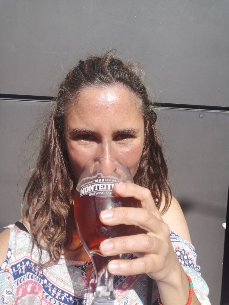 Elle avala ensuite quelques kilomètres avant de faire une halte bien méritée à Greymouth, ville connue pour ses bonnes bières. Elle se régala d’une bière ambrée, du cru de la brasserie Monteith’s, établie sur la West Coast depuis 1868. Un plaisir !