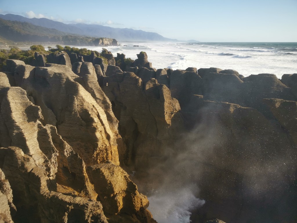 Puis, remontant la côte, elle arriva aux Pancakes Rocks. Ce sont des formations rocheuses qui, comme leur nom l’indique, ressemblent à des pancakes. L’accumulation de calcaire et de minéraux, il y a trente cinq millions d’années, puis l’érosion, le vent, la mer et la magie de la vie ont donné ces étranges formations. La mer, à marée haute, s’y engouffrait et proposait des geysers, pour le plaisir des yeux et des oreilles des touristes.