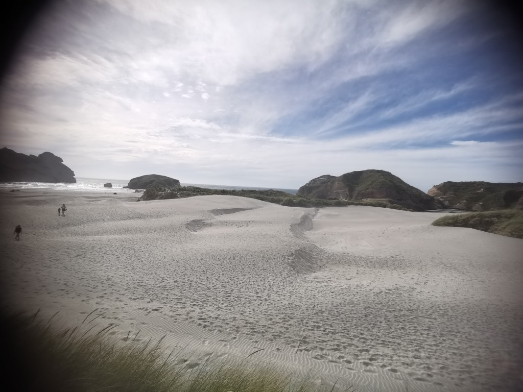 La voyageuse pris ensuite le chemin de cette fameuse plage. Wharariki Beach. Ou la plus belle plage de l’île sud. Elle se méritait. Elle se situe à l’entrée du « bec de kiwi » que représente le nord ouest de l’île sud. L’accès en voiture se fait pour les six derniers kilomètres sur une route en graviers. Puis un kilomètre de marche à pied, à travers les champs, attend les désireux. La plage était belle, de son sable blanc.